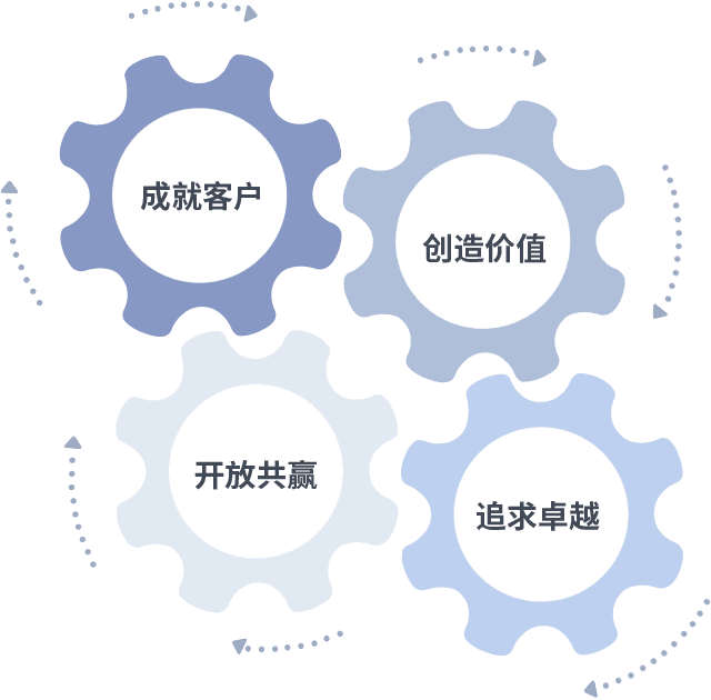 成就客户是一切决策的出发点,,,创造价值是衡量所有工作的标准,,,,追求卓越是我们做事做人的态度,,,开放共赢是我们的格局也是最终的结果。。。价值观的齿轮环环相扣,,,,推动着组织里的每个人不断向前。。。。