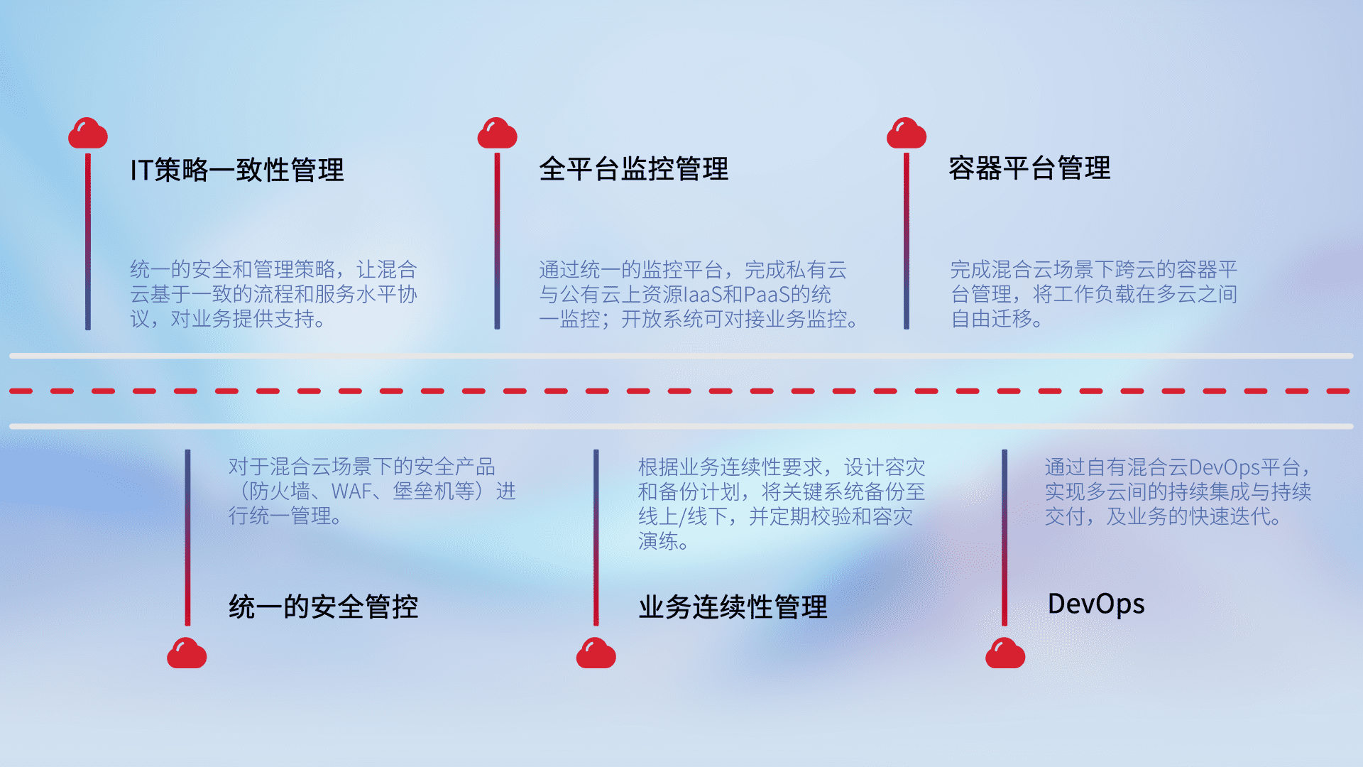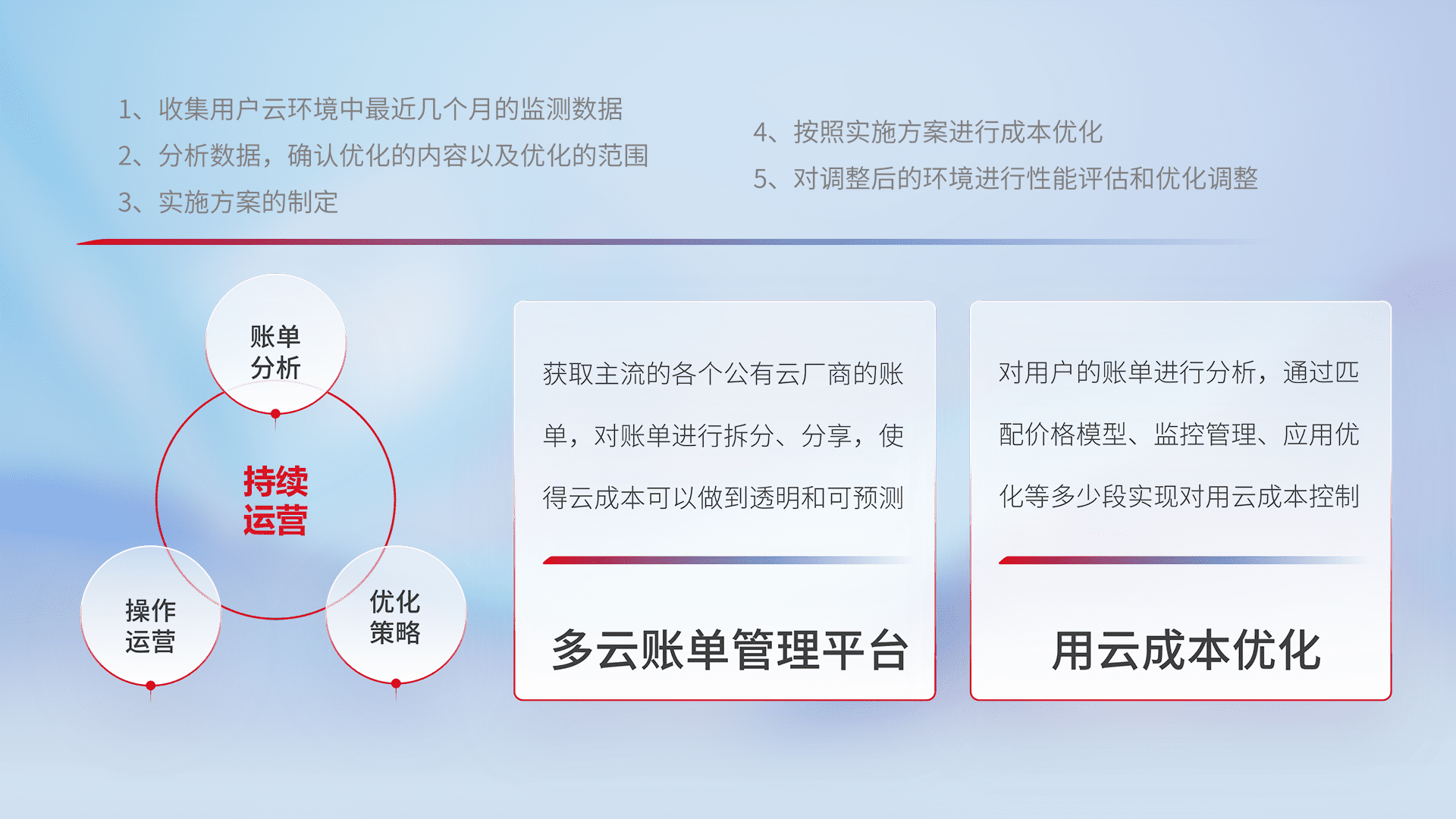 通过多云纳管,,,,以统一的资源数据模型把客户的云资源进行抽象和封装,,进而实现对多云资源的统一操作,,保障云资源管理的可靠性、、、稳定性与可用性。。量身定制化运维内容,,,配置、、、、开发运维、、补丁管理、、、备份、、、、监控、、、、认证和访问管理、、审计和日常巡检等,,,保障在用云过程中的可靠度,,,稳定度以及高可用率。。。