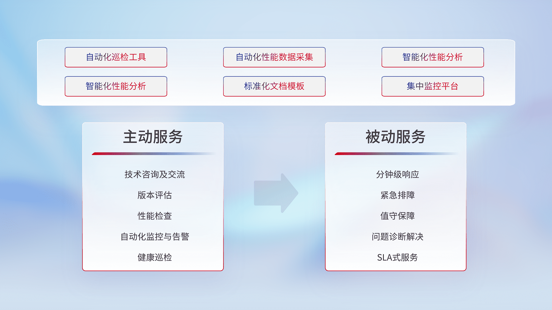 智能化工具和标准化文档,,保障服务质量,,,提供主动服务(包含技术咨询、、、版本评估、、性能检查、、自动化监控与告警、、、、健康巡检)和被动服务包含(分钟级响应、、、紧急排障、、、值守保障、、、问题诊断解决、、、、SLA服务)。。