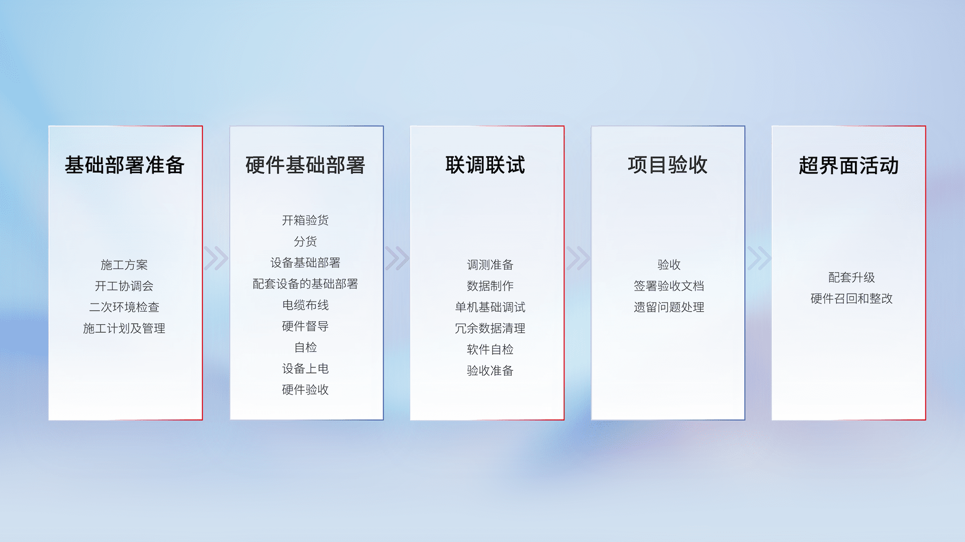 从基础部署准备、、硬件基础部署、、、联调联试、、项目验收、、、越界面活动的全过程可追溯,,,,保证施工质量和进度。。。。