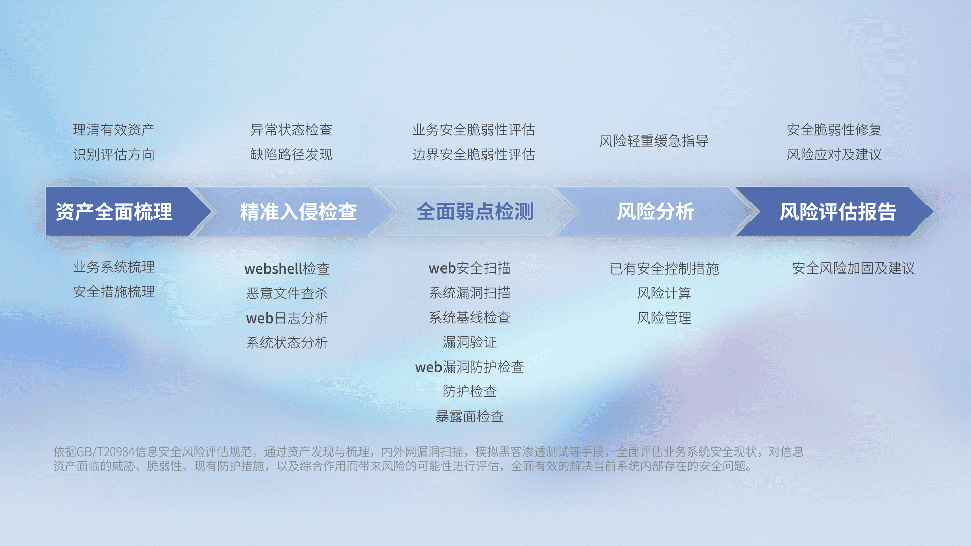 针对客户行业特性,,以专业的安全服务+多厂商联合解决方案提供专属的一站式安全管理服务,,,,帮助客户全面感知网络空间威胁,,,,基于识别、、、、检测、、、、分析、、、防护、、、监测、、、响应的服务理论模型,,,从方案咨询、、集成交付、、、、评估验证、、、、优化加固、、、、运维运营,,,致力于为客户提供完整的闭环管理式安全服务。。以实战经验为客户打造高抵御风险的安全体系,,,帮助客户发现威胁、、、对抗威胁、、、处置威胁,,不断积累安全对抗能力,,,,持续保障数字化安全。。。。
