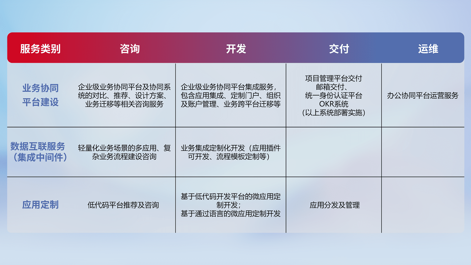 针对钉钉、、、、企微、、、IDaas等平台级产品提供产品的规划、、、方案、、、交付、、、、定制化开发等服务,,,,实现如统一协同办公、、、、智能客户服务、、、、混合会议管理、、、智能数据查询、、、、等业务场景,,,实现数字化转型。。。。